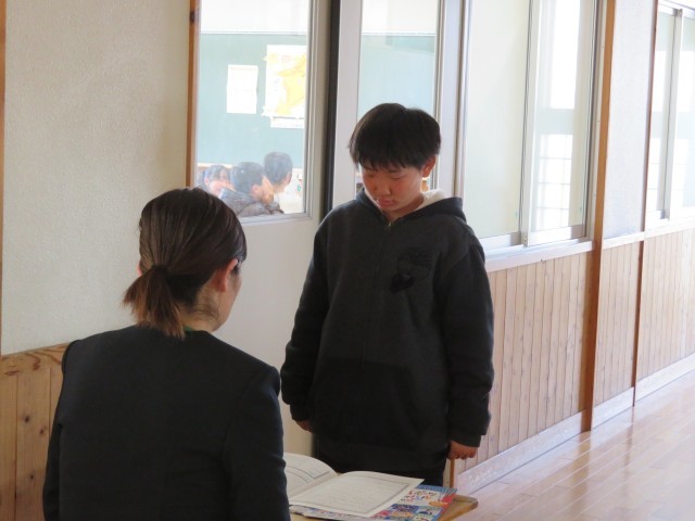 3学期や1年の頑張りを先生と一緒に振り返り、「あゆみ」を受け取りました。