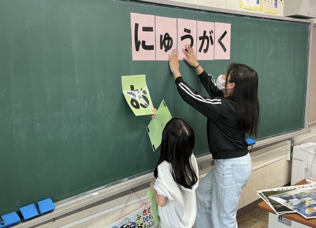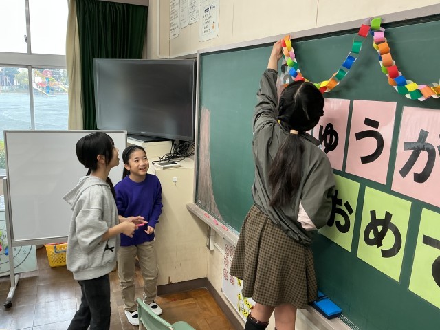 教室や学習机、窓などを掃除した後は、飾り付けです。黒板におめでとうの気持ちをこめて絵を描いたり、輪っかや花で飾ったりしました。どの教室も準備万端整いました。あとは、明日、全校のみんなを待つばかりです。