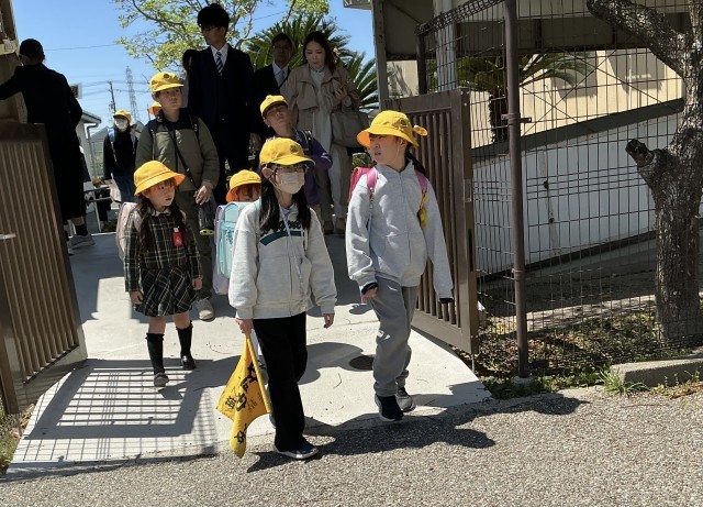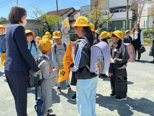 通学班のお兄さん、お姉さんと顔合わせをしました。みなさん、これからよろしくお願いします。初めての一斉下校では、通学班のみなさんと仲良く歩いて帰りました。