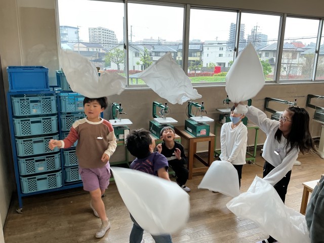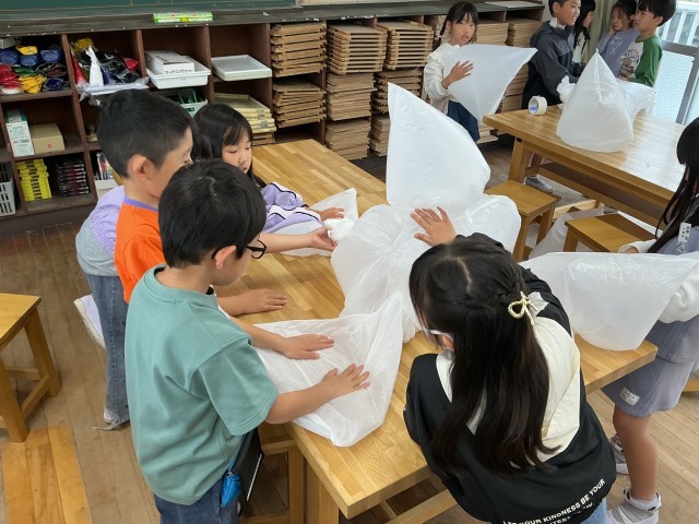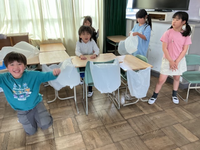 図工の学習で、ふくらませたビニール袋で遊びました。始めはひたすらぽんぽんとついて個人で楽しんでいましたが、最後にはみんなでつなげて大きな作品になりました。