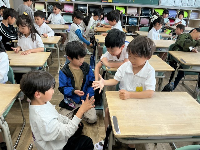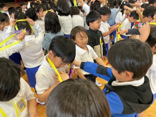 今週は1年生のペアの子と、顔合わせがありました。お兄さん、お姉さんの立場になり、優しく1年生に接する姿に頼もしさを感じました。「ようこそ さくのっ子の会」では、ペアの1年生にメダルをかけました。「学校探検」も楽しみですね。