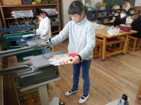 新聞紙で板を磨いています。隣の友達と和気あいあいと楽しそうです。