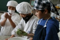ふじ・うめの「たまねぎやさん」開店中の様子です。前日までにみんなで一つ一つ確かめながら重さをはかって袋づめしました。せりふも、お金の計算も練習しました。たくさんのお客さまが来てくださって大忙しです。ちょっと緊張……それでも笑顔を忘れずに「ありがとうございます!」ていねいに渡しています。