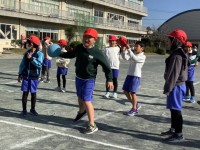 3年生の「ぐるぐるタイフーン」の練習風景です。上手にバーを跳ぶためにみんなで息を...