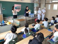 調理場の方を講師に、給食についての出前講座を行いました。給食はとても大きい道具を使って、一度にたくさんの量を調理していることを「あんきゅー」と一緒に学びました。