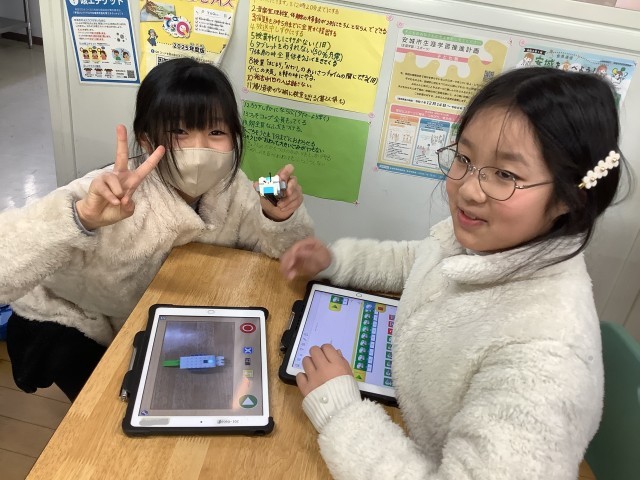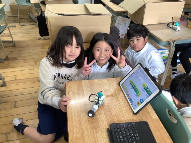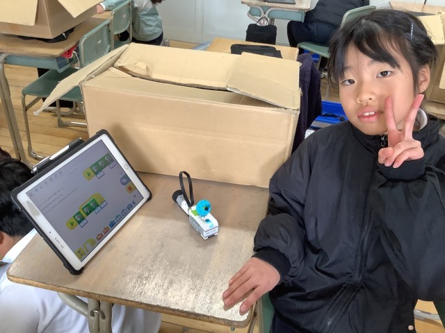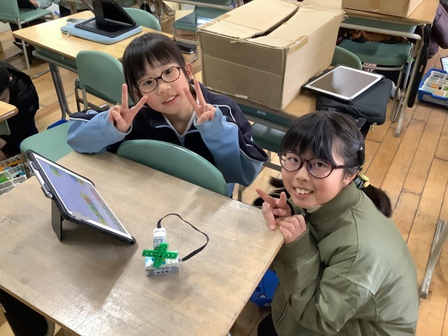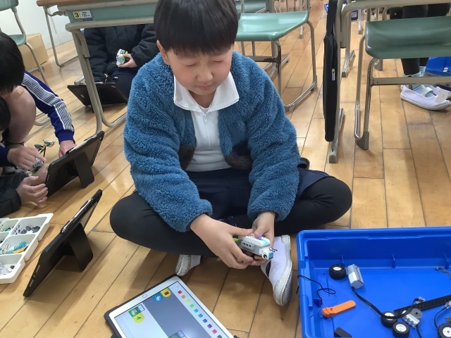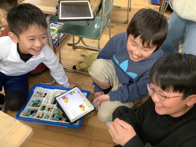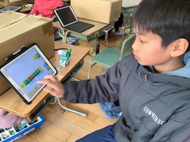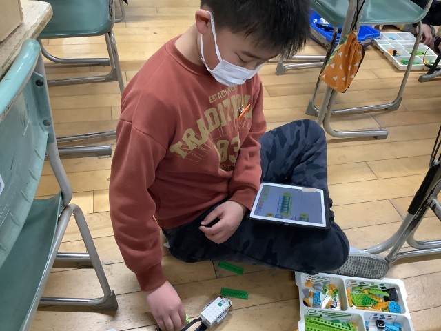 子ども一人一人のMyタブレットとレゴブロックのコンピュータを接続して、動く、音を出す、繰り返すなどの動きをプログラミングしました。