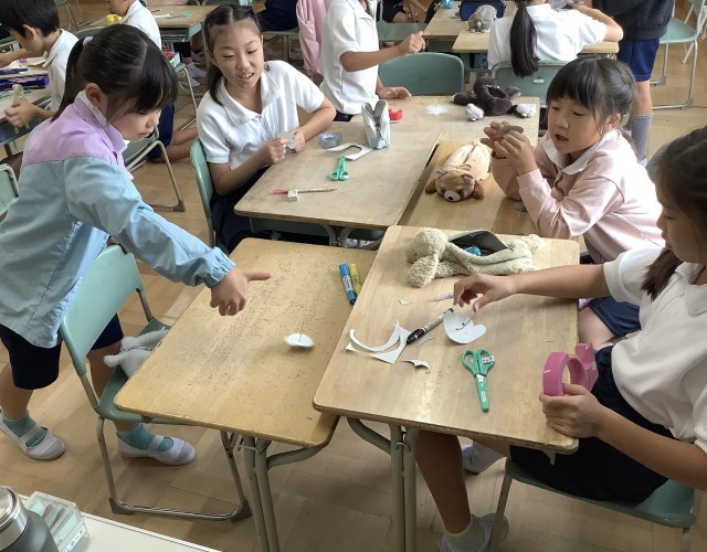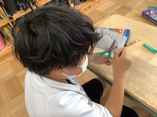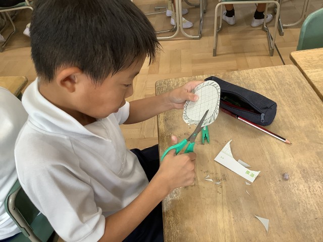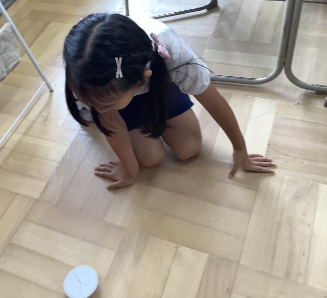 「円や球」についての学習が始まりました。今日は、こまをつくりました。厚紙に好きな模様を描いて切り抜きます。好きな色で、自由に3つ点をつけます。先生に穴を開けてもらって楊枝をさしたら完成です。回してみると…不思議なことに、どんな形のこまも円に見え、3つの点がなぜか円に見えました。不思議がいっぱいで、これからの学習がとても楽しみになったようです。