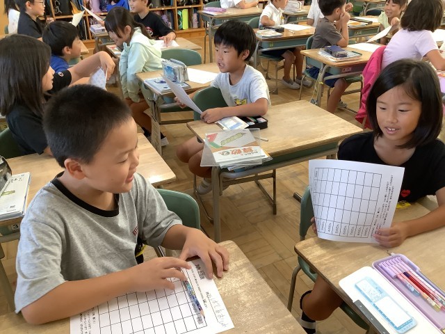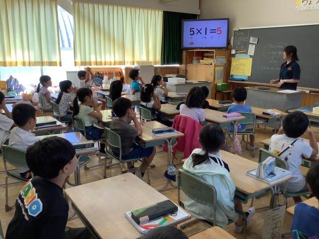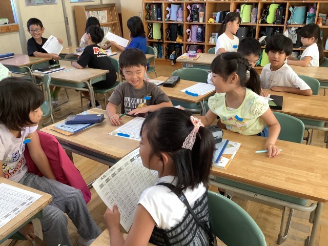 九九が始まりました。5のだんと2のだんを言えるように練習しています。「上がり」「下がり」「ばらばら」の3通りを友達どうしで聞き合っています。