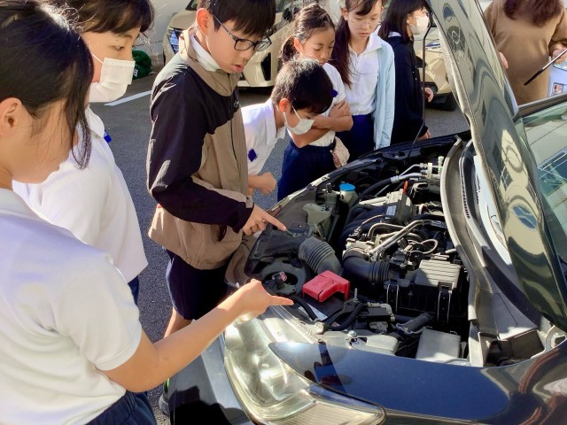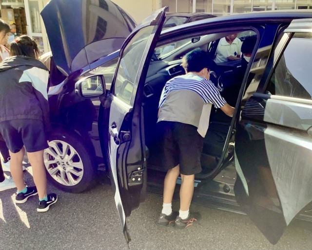 自動車にはどんなひみつがあるのだろう。子どもたちは、ボンネットを開けて、中を見たり、車内を見たり、車の下を見ながら、ひみつを一生懸命探しています。