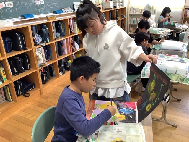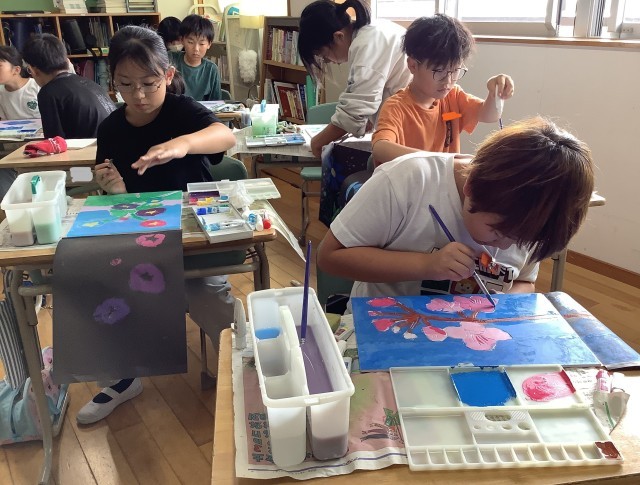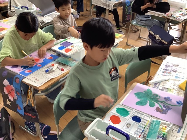 版画作品を制作中です。色をぬりました。中心に大きく描かれた花々にあざやかな色をつけて、華やかな作品ができつつあります。