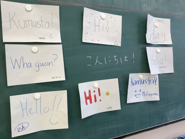 5年生の英語の授業に、ゲストティーチャーが来てくださいました。ジャマイカ、アメリカ、フィリピン、オーストラリア等の国から来られた先生方です。自分の名前や好きなこと、好きな食べ物など、自己紹介などをするトークタイムは、とても楽しそうでした。