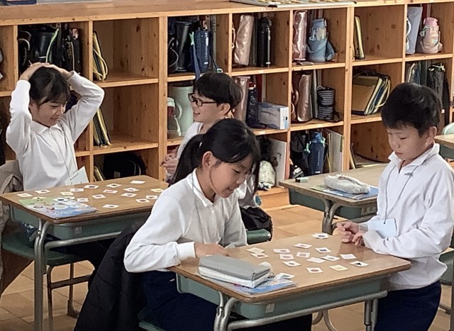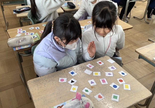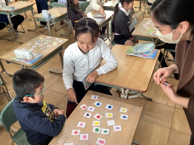 レッド、イエロー、ブルーなど、たくさんの色を表す英語と、サークル、トライアングルなど形を表す英語を覚え、カード取りゲームをしました。「レッド・スクエアー」など、集中して英語を聴いてカードをさがします。色と形の英語が組み合わさった問題ですが、しっかり聴いて、素早くカードを取っていました。