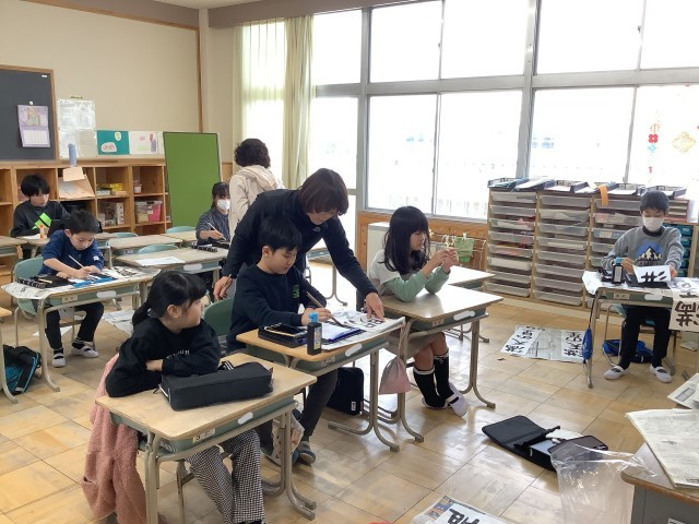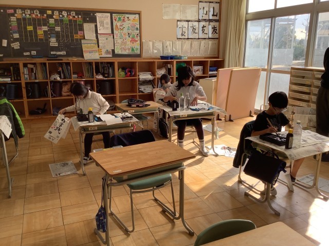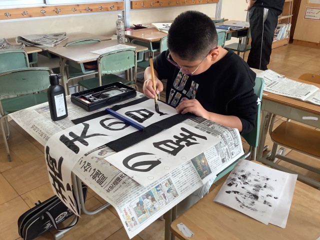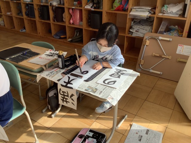 書き初め会がありました。みんな、練習の成果を出して、真剣にかきました。