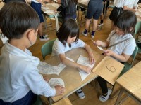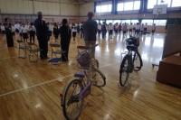 体育館では、ゴムハードルで練習しました。「トン、1,2,3」などリズムをとりながら跳びました。はじめは、一歩一歩確かめつつ、ゆっくり跳びましたが、慣れてくると、スピードを上げて跳ぶことができるようになりました。