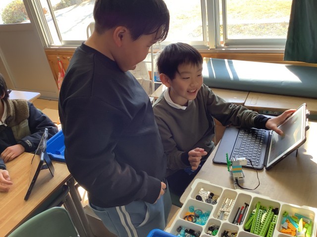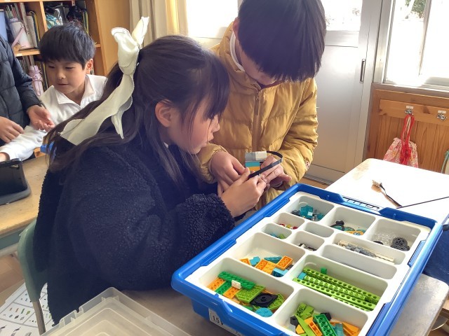 ペアで、「こうじゃない?」「なるほど」など、考えを出し合ってすすめていました。一人では困ってすすまない学習も、考えを出し合うことでどんどん解決します。完成して、動くととてもうれしそうでした。どうプログラムして、どう動かすか考えるのも楽しそうでした。