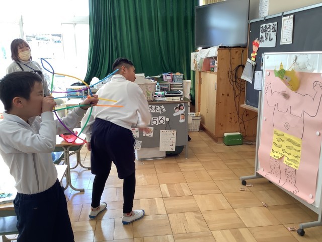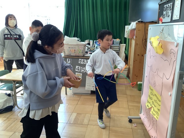 いずみ学級の前に鬼がいました。豆まきを楽しみました。