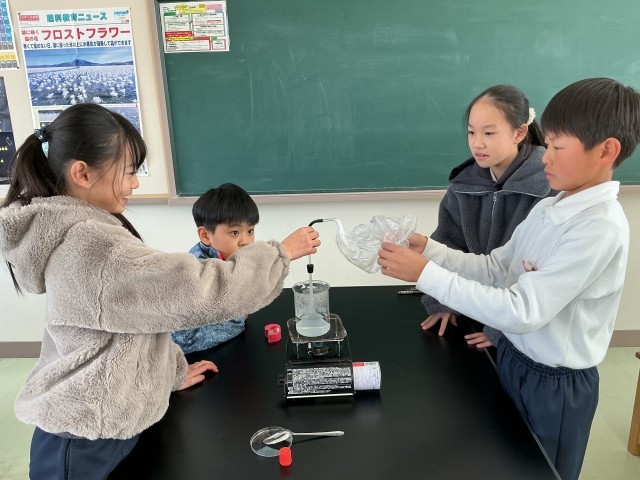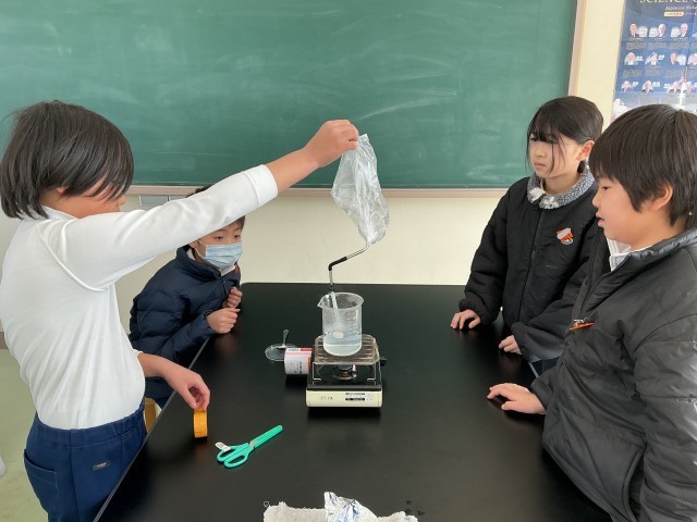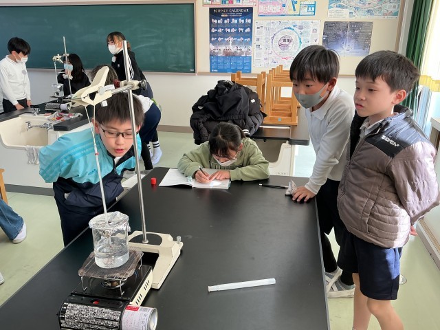 水を熱するとどんな変化が起こるのか、実験観察しています。100℃近くまで温度が上がるのを見て、びっくりしたようです。