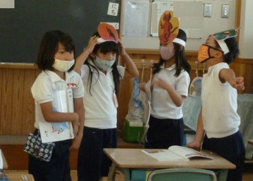 お話を劇にして表しました。見ている人に、うまくお話の様子が伝わるようにしたいな。読み方や、動きも考えました。ろうかで、発表直前の作戦会議です。<グランドデザイン:学びづくり>