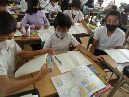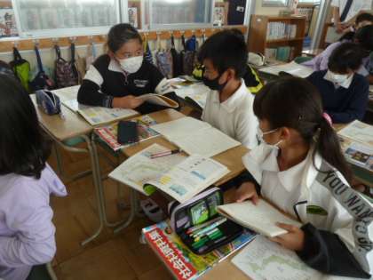 日本の工業について学習をしています。資料を読み取り、気付いたことをグループで話し合いました。<グランドデザイン:学びづくり>
