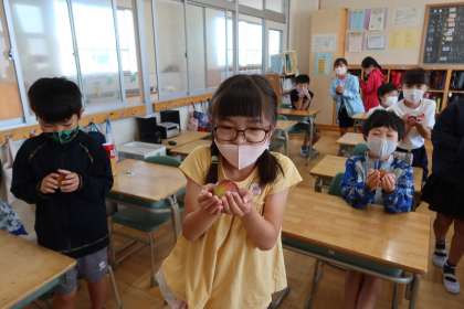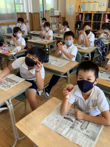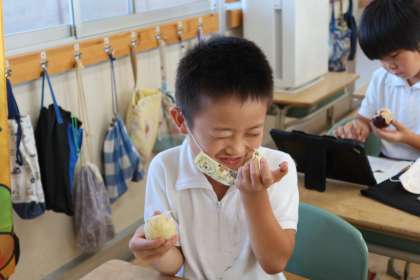 3年生がJAあいち中央様からいただいたイチジクを試食しました。「秀品」のランクの箱に入ったきれいな赤いイチジクを見た子どもたちは大喜びです。一人に一個ずつイチジクをもらうと、大事そうに両手で持ってじっと見つめています。新鮮なイチジクを食べた子どもたちから、素敵な笑顔がこぼれていました。<グランドデザイン:学びづくり>