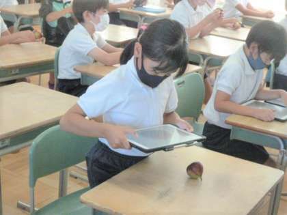 JAの方からいただいたいちじくを、みんなで食べました。写真に撮ってじっくりと観察したり、皮をていねいにむいてほおばったりする姿がみられました。<グランドデザイン:学びづくり>