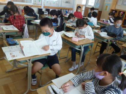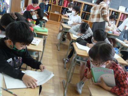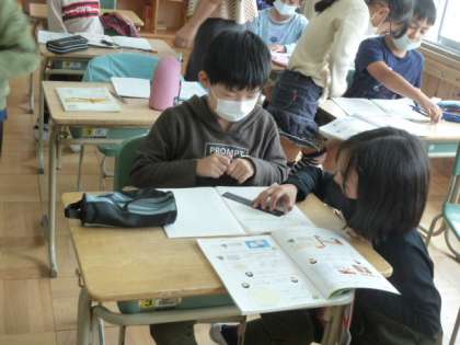 円について学習しています。直径・半径について、自分の考えを友達に説明しました。自分のノートを見せながら、伝えています。