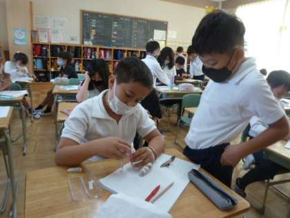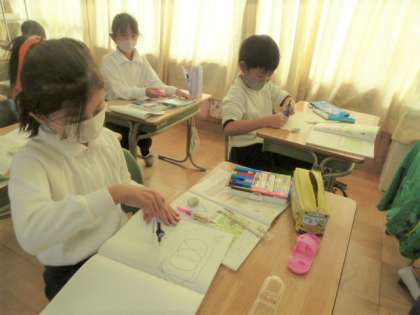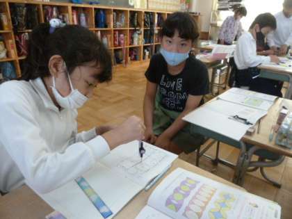 コンパスを使って、きれいな円をかく練習をしています。今日は、円を使った模様をかきました。うまくコンパスを操作するこつがだんだんわかってきました。<グランドデザイン:学びづくり>