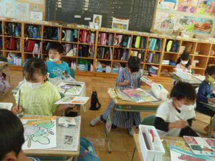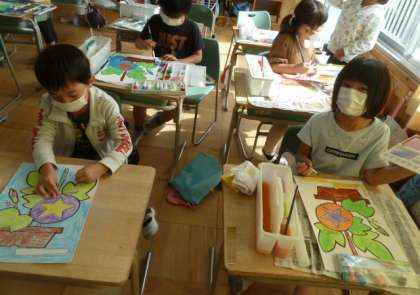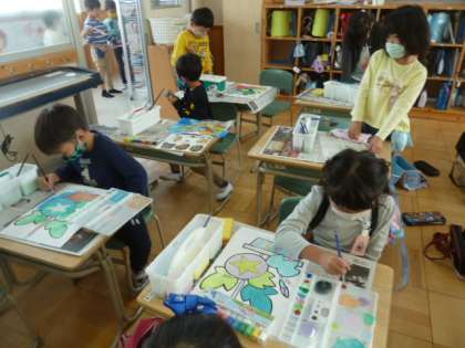 絵の具を使って、色を塗りました。水をどのくらいつけたらよいのか、はみださないように塗るには、筆をどう動かせばよいのか、試しながら学んでいます。<グランドデザイン:学びづくり>