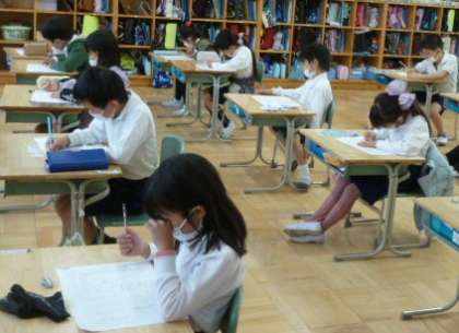 国語のテストをしました。一人一人、静かに落ち着いて机に向かい、集中して考えることができました。とても成長しましたね。