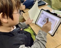 薄い板を切って、メッセージボードを作っています。のこぎりで板を切るのは、なかなか大変ですが、とてもおもしろいです。慣れてくると、力を入れなくても木を切ることができました。
