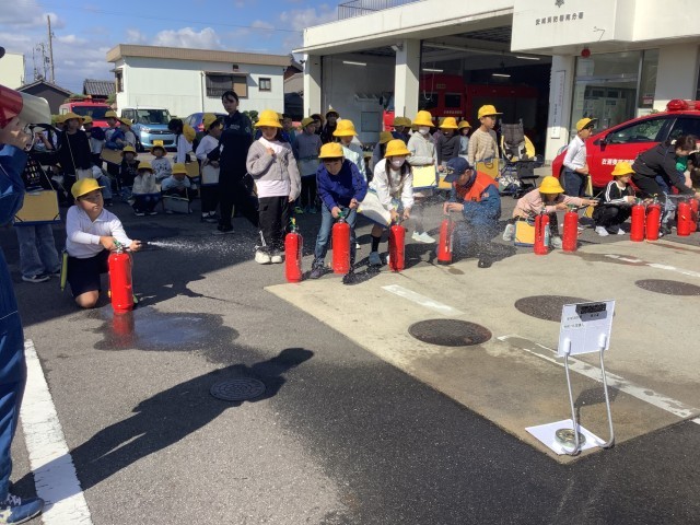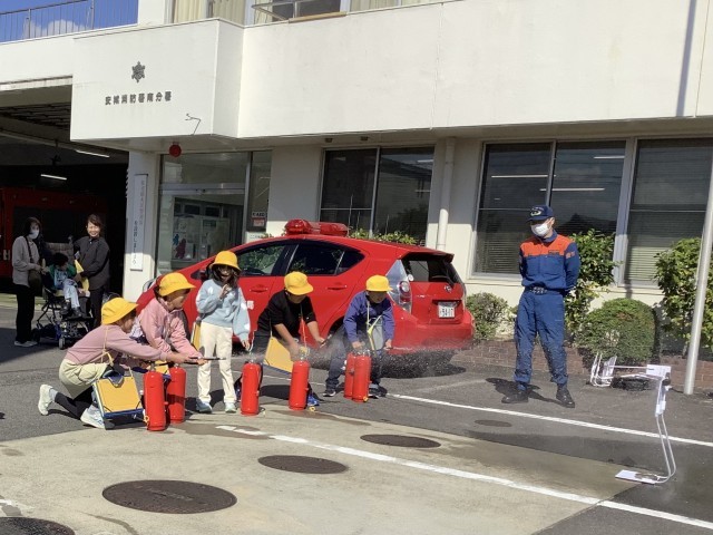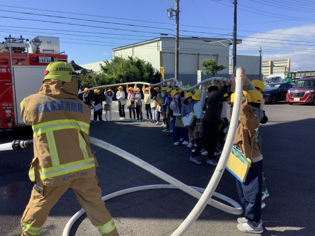 消防士の方が防火衣を着たり、放水をしたりするところを間近でみることができました。
