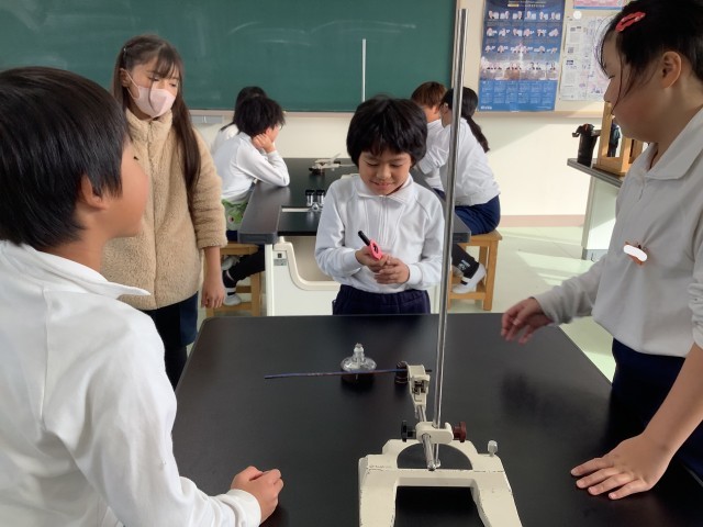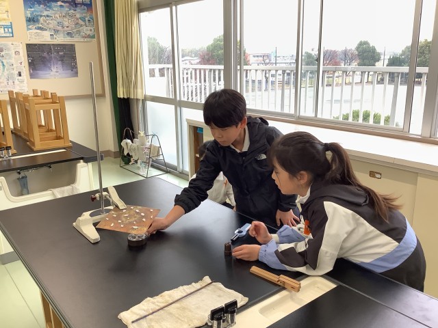 金属の棒や板の一部をアルコールランプで熱して、どのように熱が伝わっていくかを実験して調べました。アルコールランプの扱いがだいぶ上手になってきました。
