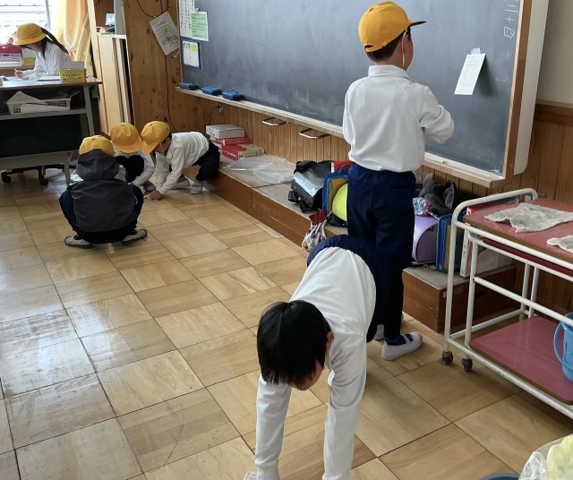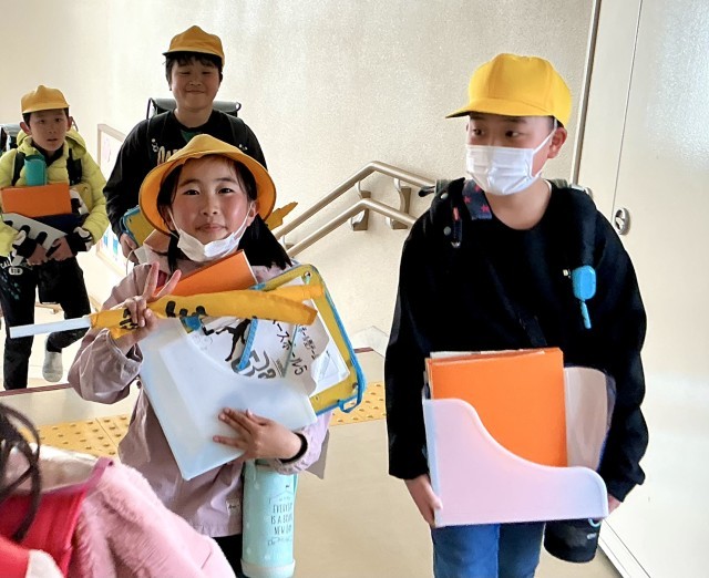教室移動がありました。学習セットの数を調整するために、4、5年生が中心となって運びました。教室では、お世話になった教室を、最後の最後まで掃除する姿がありました。準備万端整えて、新しい教室へ出発です。