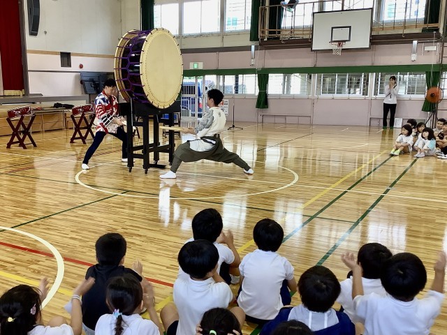 2人の和太鼓の演奏者におこしいただきました。お腹の中まで響く大きな音に圧倒されながらも、初めての和太鼓の演奏を楽しんでいました。