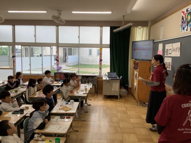 歯科指導がありました。まず、口の中に何があるか見ました。「歯」「歯ぐき」「舌」と、鏡に映る自分の口の中を、じっくり見ました。歯だけではなく、歯ぐきもじょうぶでないと健口(健康)ではありません。「歯ピカツ 8(エイト)」という、歯の健康のためにやるとよいこと8つを教えていただきました。