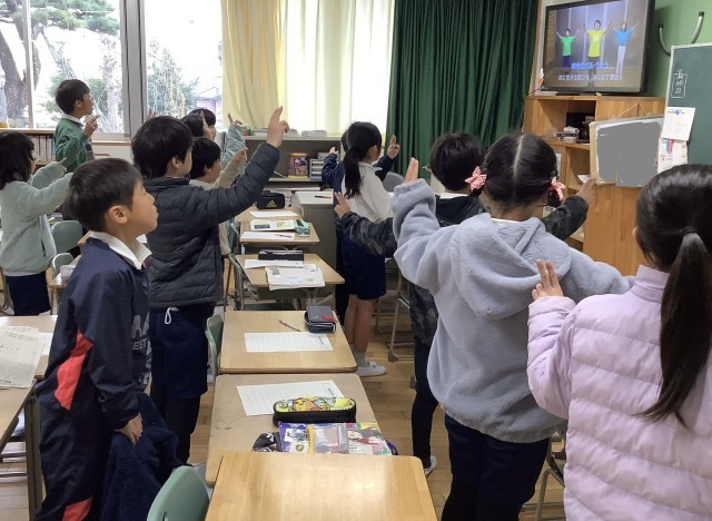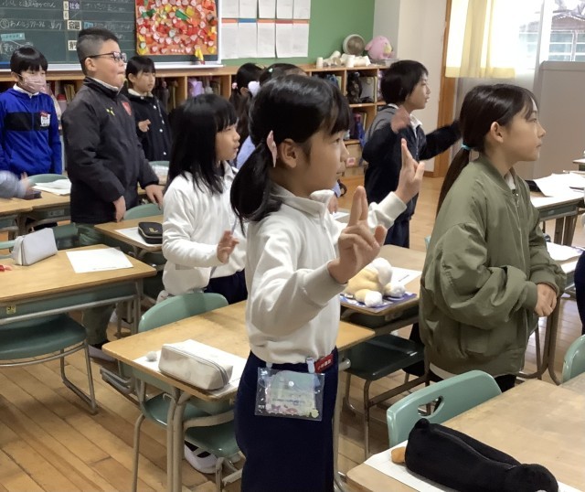 3年生は、総合的な学習で福祉をテーマに学習を進めてきました。朝の歌では、「手をつなごう」を歌っていますが、手話を付けて歌う練習をしています。