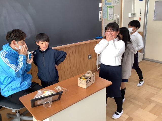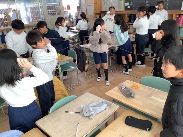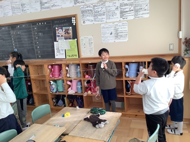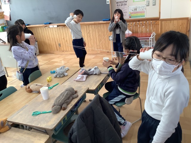 音はゆれることで伝わっていくことを学習しました。この授業では、グループのみんなで一斉にできる糸電話を作って、音が伝わるか試しました。最後は、先生の暗号クイズをしました。各グループのワードをつなげて出てきた答えは…?