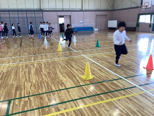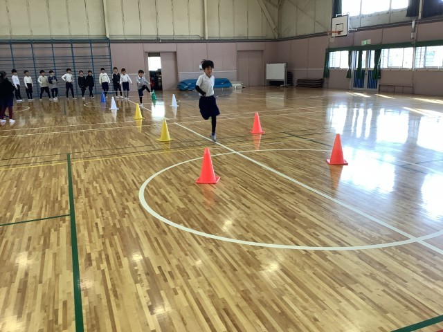 体育館では、ゴムハードルで練習しました。「トン、1,2,3」などリズムをとりながら跳びました。はじめは、一歩一歩確かめつつ、ゆっくり跳びましたが、慣れてくると、スピードを上げて跳ぶことができるようになりました。