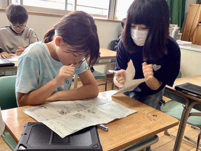 「主人公のゆみ子は幸せに生活できているのか」という問いに、本文をもとに、友達と意見交換しながら学習を深めています。