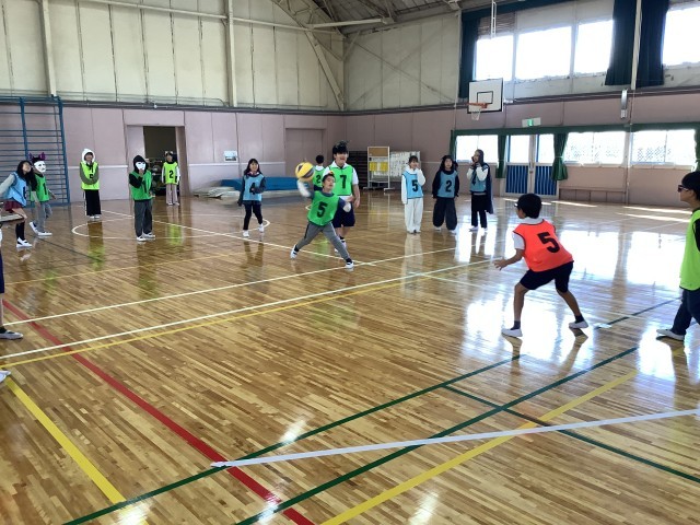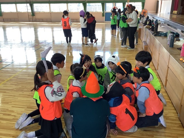 学級のみんなが仮装をして、とても楽しい雰囲気です。王様ドッジボールをしました。まず、誰を王様にするか、作戦タイムです。始まりの合図が鳴ると、思い切りボールを投げたり、すばやくかわしたり…とても盛り上がりました。