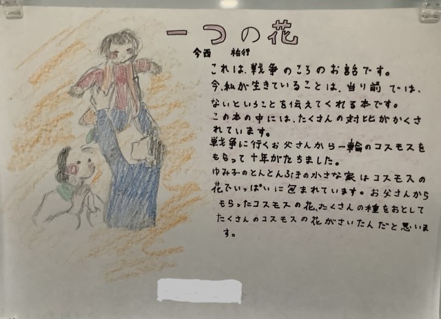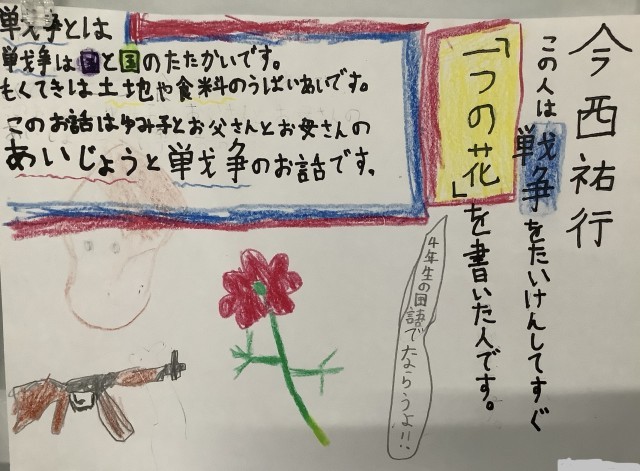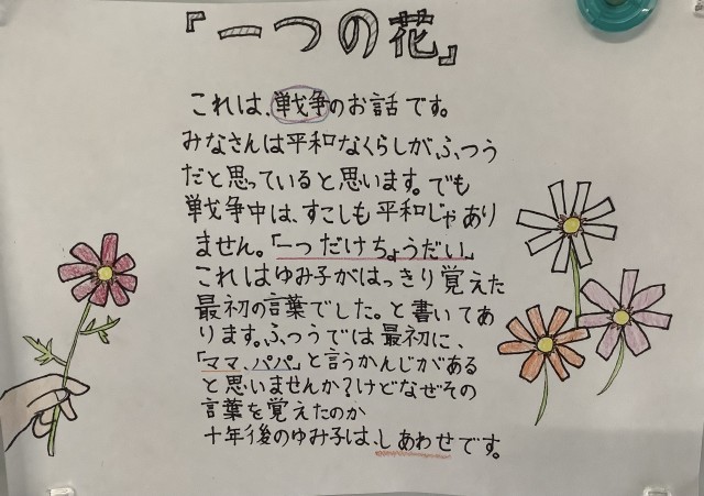 4年生の国語科教材「ひとつの花」という物語の読み取りをもとに、お話のPOPを作成しました。考えや意見を出し合って、学級のみんなで読み取ったことがPOPの文や絵に表れています。POPを作成したみんなの、感動や思いが伝わってきます。