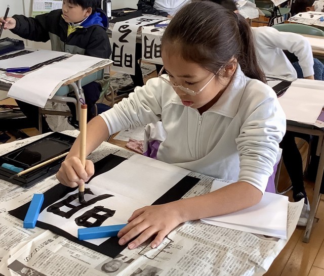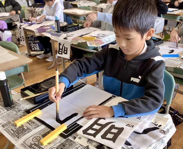 書き初め用紙を使って練習が始まりました。今までは、半紙に書く練習だったので、一層気持ちが入っています。