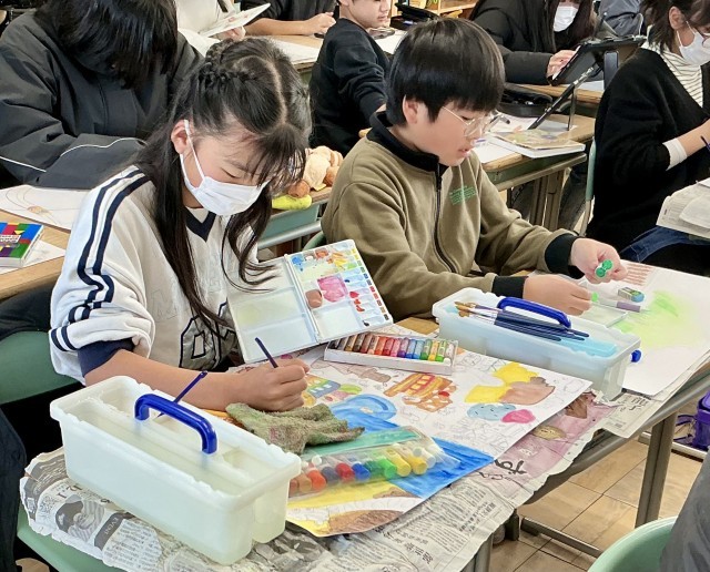 色をつけて刷ってみては、色のつき具合を確かめ、ていねいにていねいに作業をすすめていました。版画作品づくりも仕上げに入ってきました。力作ぞろいです。作品展を楽しみにしていてください。