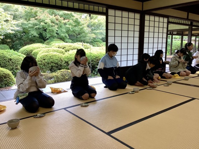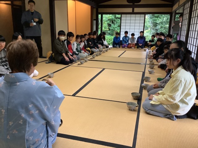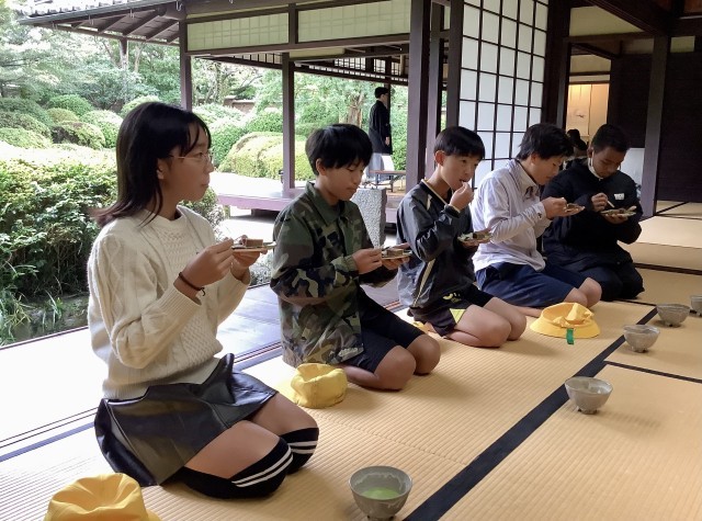 丈山文庫や京都で詩仙堂を実際に見学し、学びをすすめている6年生は、丈山苑で茶の湯体験をし、抹茶と和菓子を味わいました。