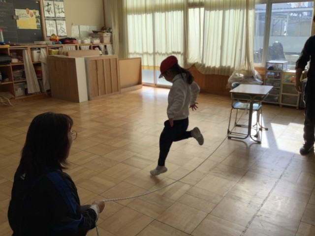 なわを跳びこす練習です。繰り返し、繰り返し挑戦していました。みごとに跳びこせたときは、みんなで喜んでいました。