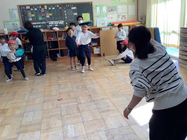 フリスビーを受けるのも、投げるのもとても上手です。いずみの体育学習は笑顔でいっぱいです。