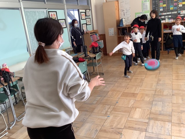 相手に取られまいと、強くアタックを打ったり、風船を落とさないように、素早く動いて受けたりと、よい動きがたくさん見られました。点が決まると、にこにこ笑顔で喜んでいました。