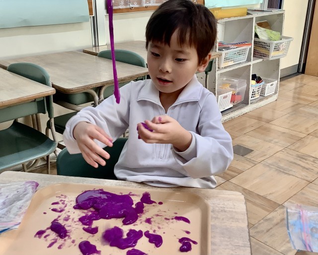 伸びる様子、ネバネバする感触を楽しみながら、スライムで遊びました。
