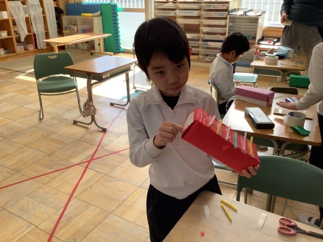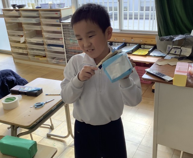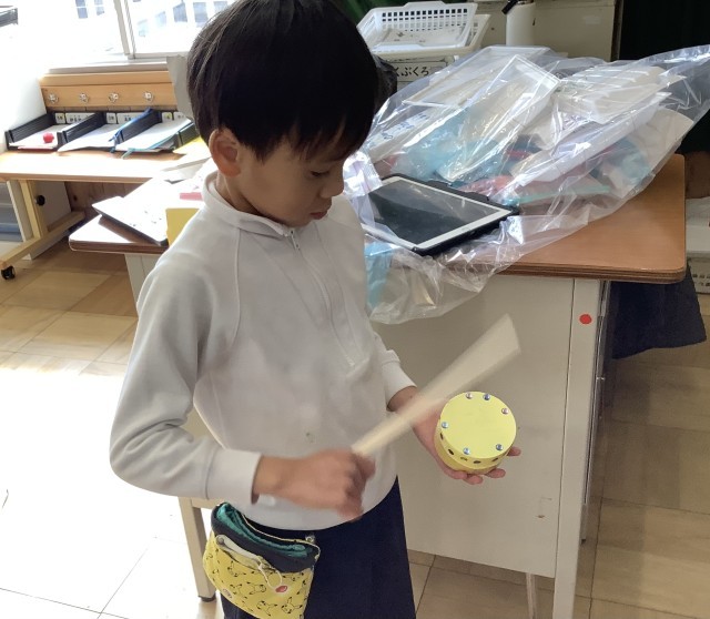 この授業では、ギロという楽器づくりを行いました。とはいえ、ギロがどのような楽器かわからなかったので、まずは、ギロという楽器について知る学習をしました。夢中になって作り上げると、鳴らしてみたくなったようです。これまでに作った楽器も箱から取り出して、鳴らすのを楽しみました。