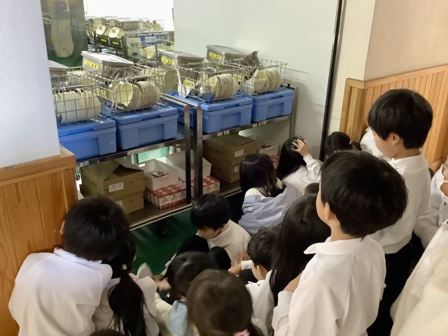 ここは配膳室です。配膳室のお仕事を見学して、子どもたちの栄養の源、給食のひみつを勉強しています。